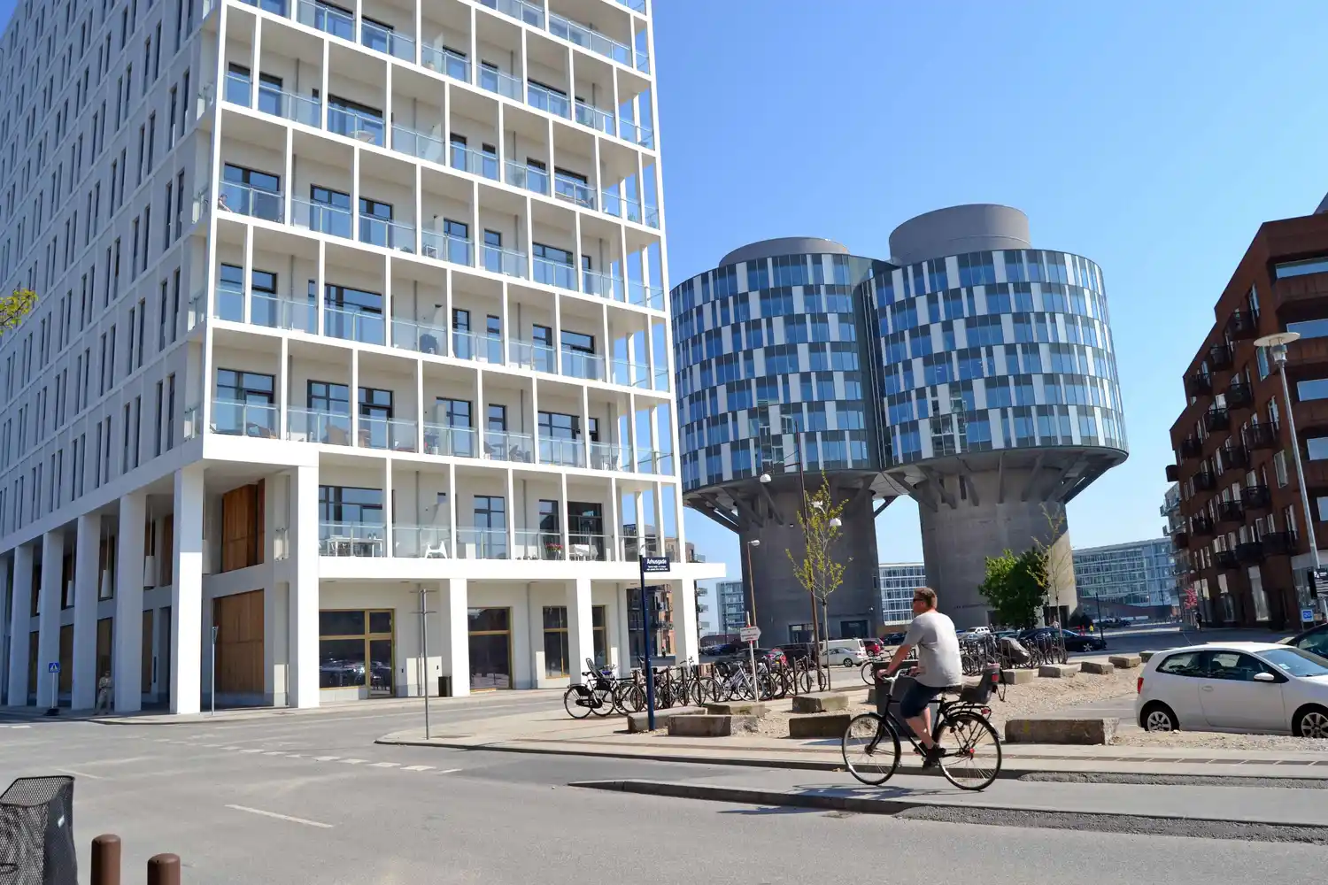In Copenhagen's Nordhavn, an old grain silo has been transformed into modern housing. Free Harbor Tower (Frihavns Tårnet), designed by Praksis Architects, features 11,000 sqm of residential space spread over 12 floors, with ceiling heights ranging from 3 to 3.7 meters and balconies.