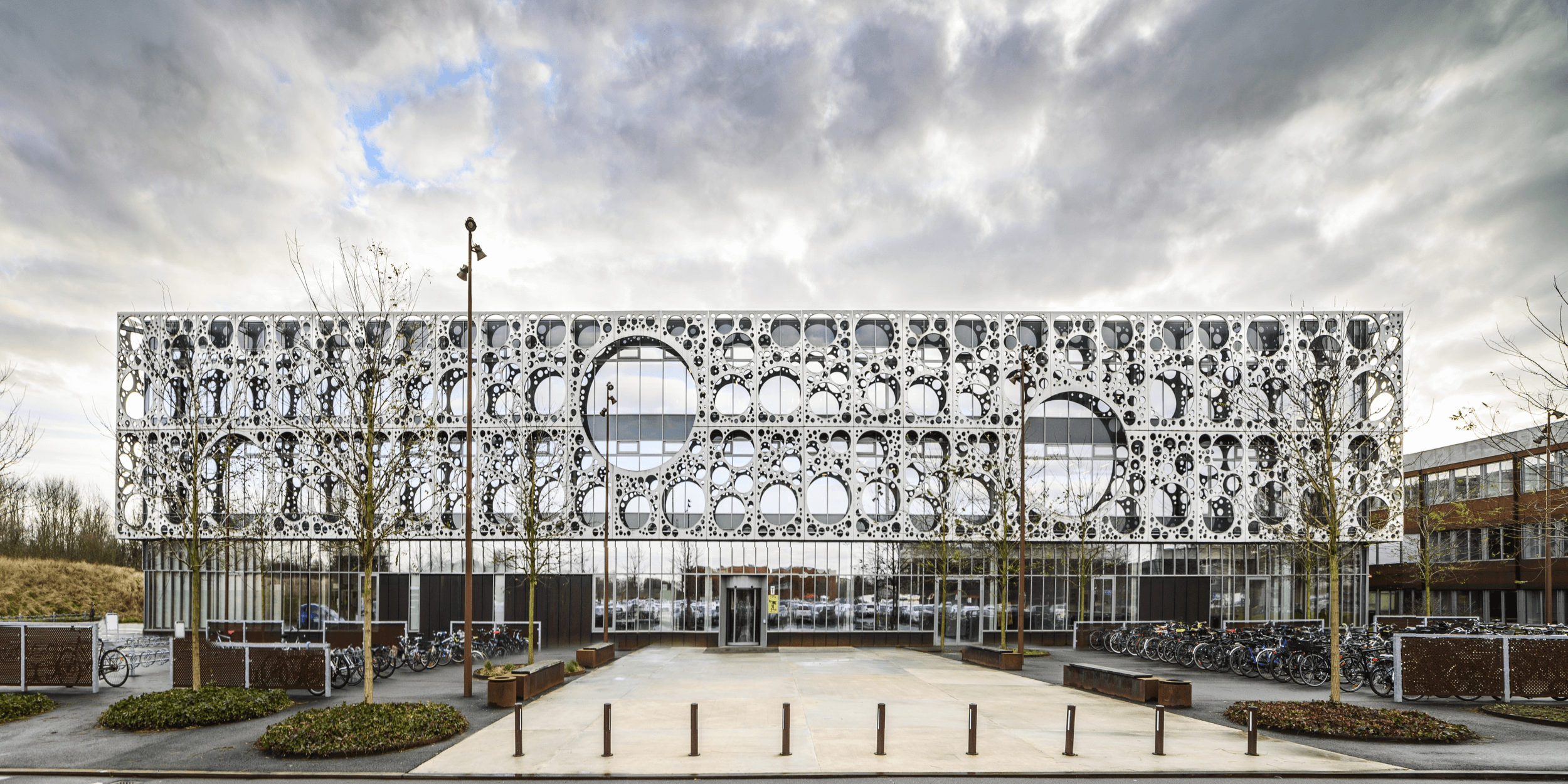 Etäältä katsottuna tämä tiedekuntarakennus näyttää reikäjuustolta. Se on julkisivu, joka herättää huomiota, mitä sen on tarkoituskin tehdä, koska sen sisällä tehdään kansainvälisen tason tutkimusta. Anna Maria Indrio, entinen partneri ja arkkitehti C.F. Møllerin toimistosta selittää: